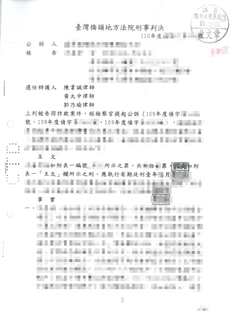 本所當事人因涉犯詐欺遭起訴而向本所求助,經本所律師分析卷證,勸籲當事人認罪,和解,最終當事人雖無法全數和解,且被認定犯數十罪,但仍在本所律師積極爭取減刑下,使當事人獲判之刑度受到相當之酌減。